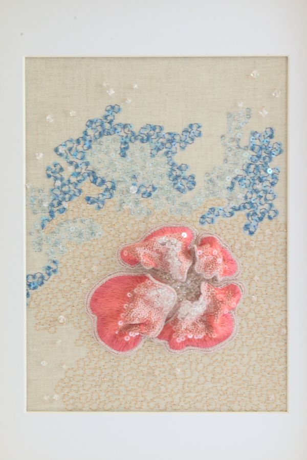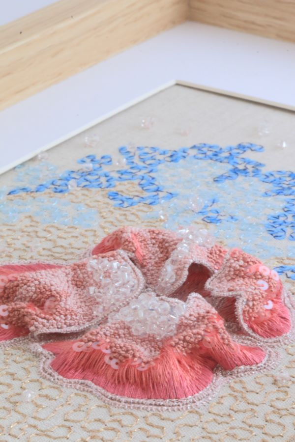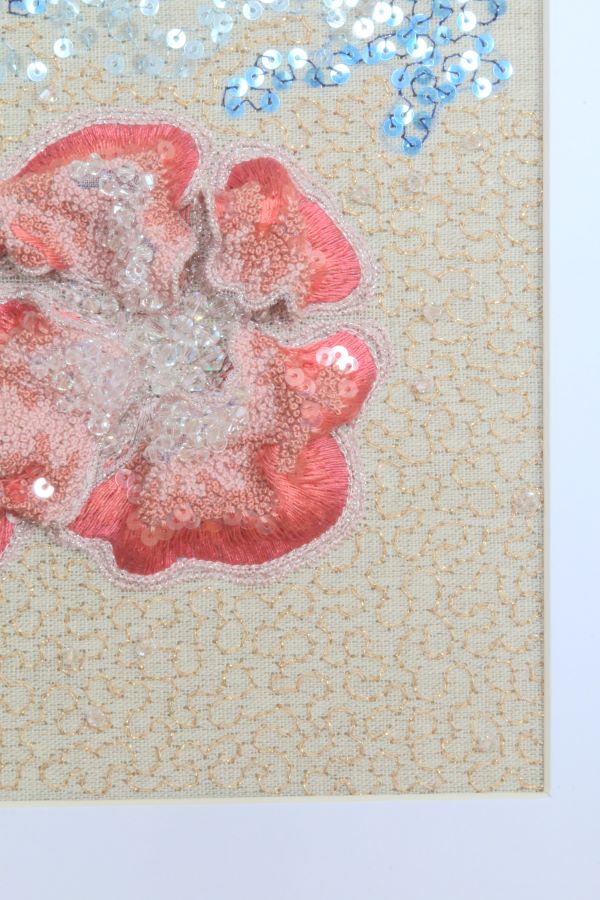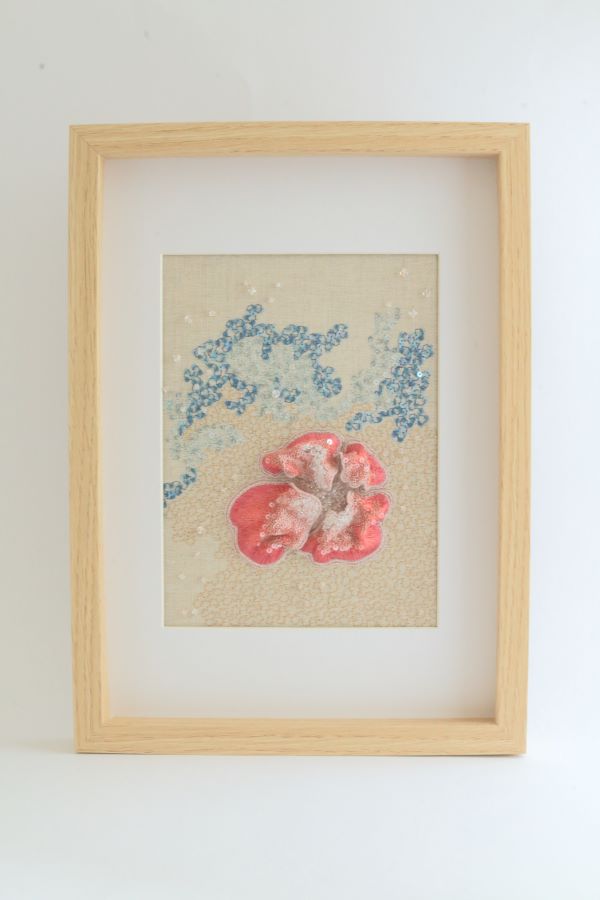 La toile est tendue sur un carton gris et encadrée dans une vitrine pour préserver le volume de la broderie – la composition mesure l14cm x L19cm, et le cadre l23cm x L32cm x P3cm. Pièce unique.
