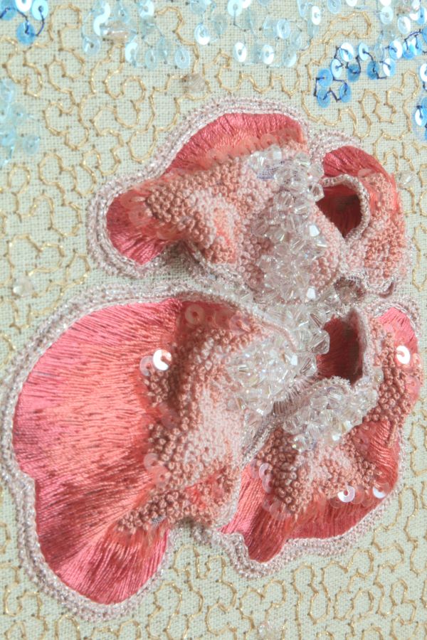 « Trifide » est une broderie au Lunéville et à la main, réalisée sur une toile métis lin et coton. Le fond est brodé de plusieurs vermicelles de paillettes Langlois-Martin ou de fil pailleté Günold, réhaussé d’un amas de toupies en cristal PureCrystal. Quatre pétales brodés de soie Au Ver à Soie et de toupies cristal viennent créer le volume de la composition.